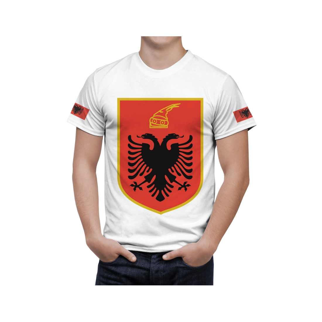 The `Albania Coat Of Arms T-Shirt` is featuring multicolour, cotton blend, crew neck and short sleeves. The brand logo together with the unique print on the `Albania Coat Of Arms T-Shirt` is instantly recognizable making you easily noticeable. We have specially designed this t-shirt for the fans of this brand.
