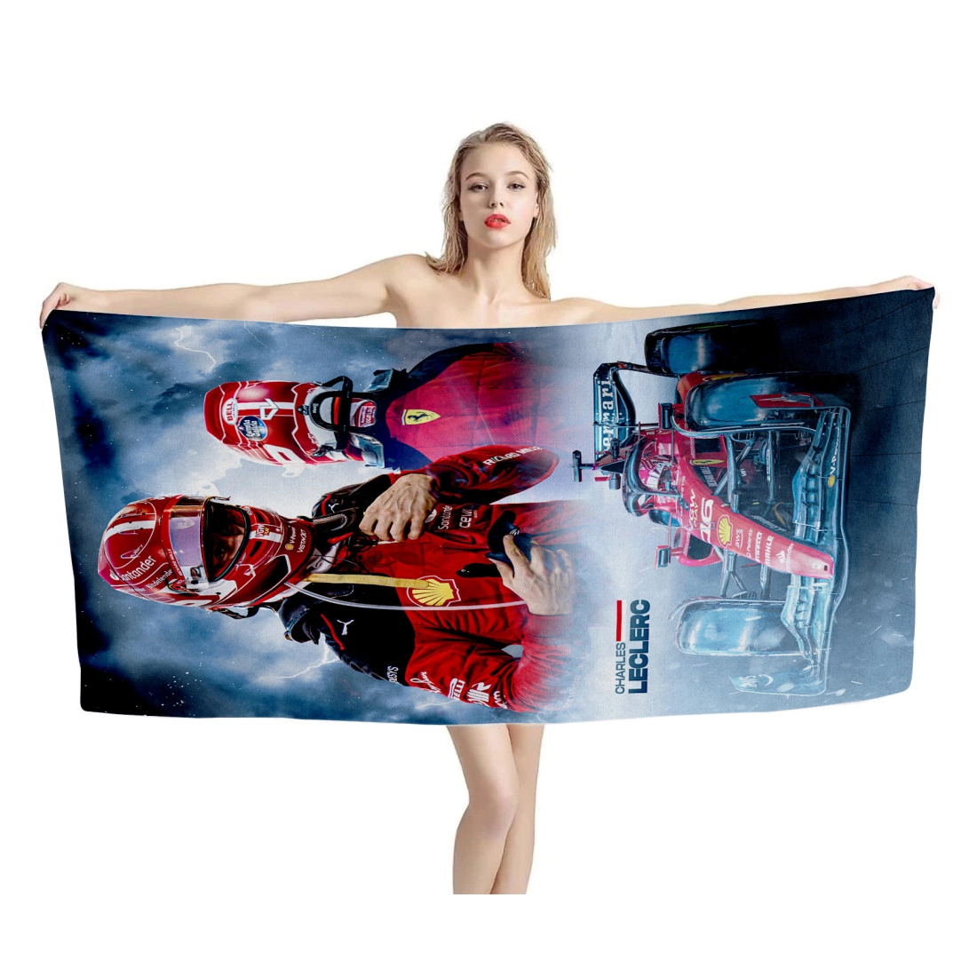 Get this unique and adorable Charles Leclerc F1 Ferrari Beach Towel. Printed design is edge-to-edge on fleece face in vibrant full-color with our unique printing process that is durable and won't fade or bleed! Our premium beach towel is printable on a single side only.