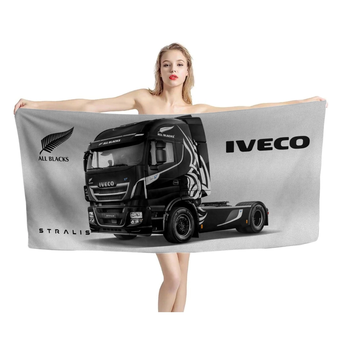 Get this unique and adorable Iveco All Blacks Stralis Truck Beach Towel. Printed design is edge-to-edge on fleece face in vibrant full-color with our unique printing process that is durable and won't fade or bleed! Our premium beach towel is printable on a single side only.