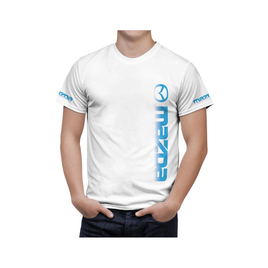 This is a Mazda White hand made t-shirt.
